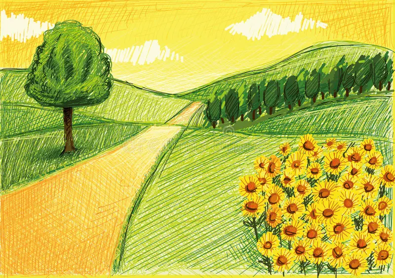 3. Rural Landscapes: Picturesque countryside vistas, rolling hills, pastoral meadows, and sun-kissed fields are frequently portrayed in agricultural drawings, capturing the serenity and simplicity of rural life.